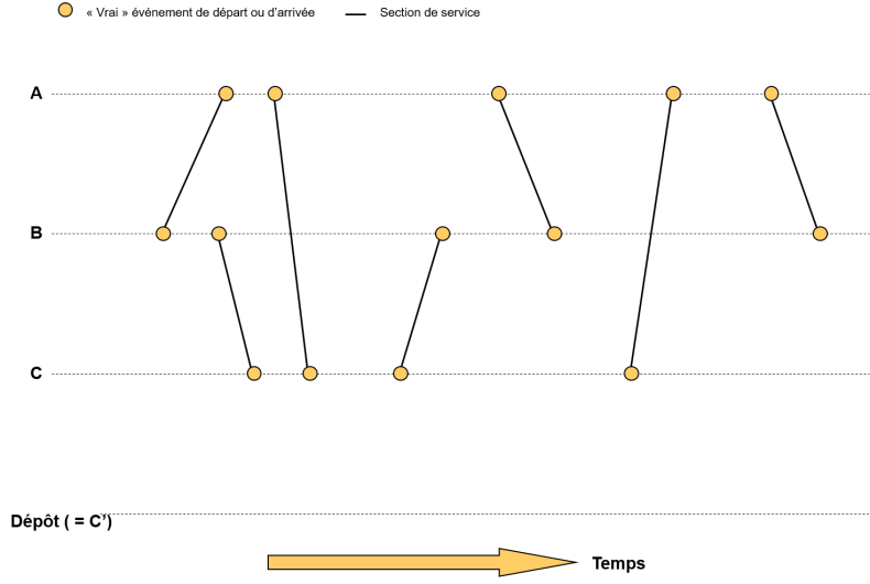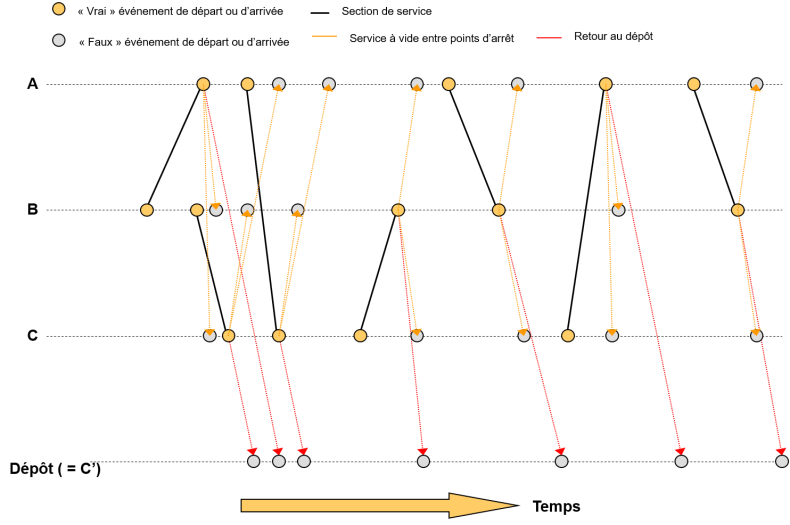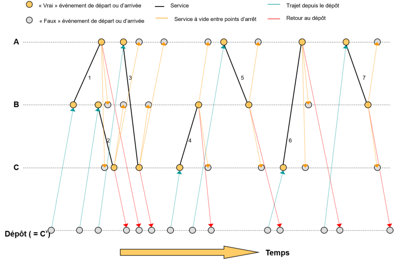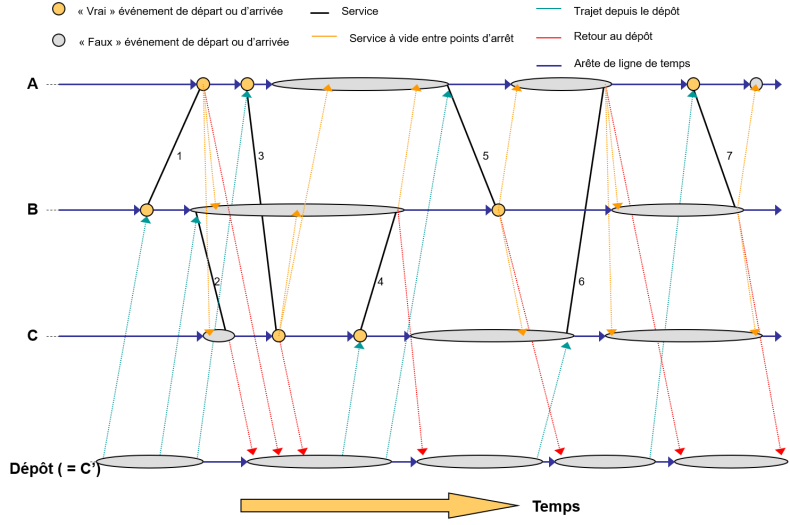 - Le temps d’arrêt technique et le temps d’arrêt technique en dépôt décrivent la durée entre les instants des nœuds reliés par des arêtes