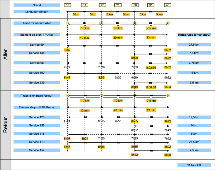 Pour le bus, KmService (TI1) = 113,75 km. Le calcul est explicité à l’aide de l’Illustration 210.