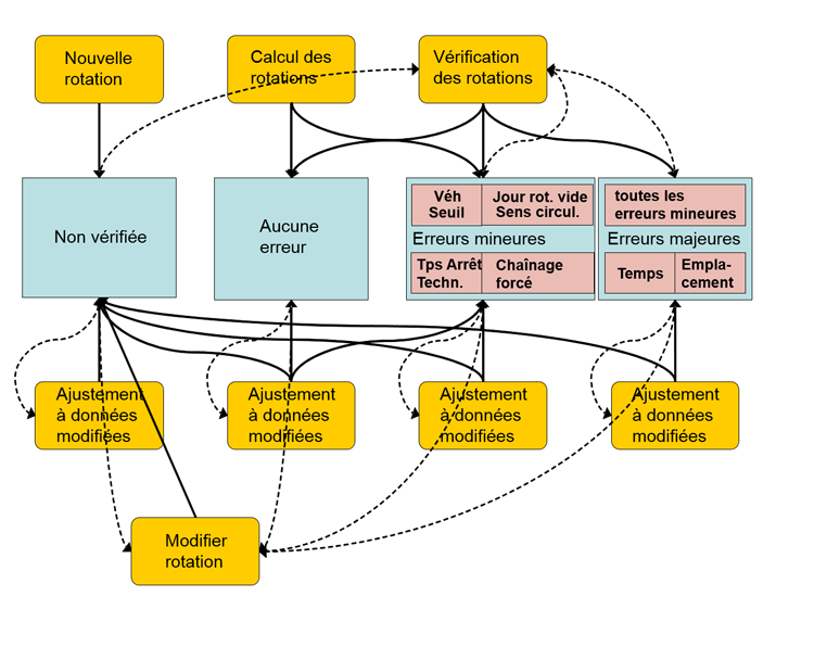 Lorsqu’une rotation comporte les indicateurs non vérifié ou une erreur temporelle ou d’emplacement, elle ne peut être utilisée pour les évaluations ultérieures (par exemple la procédure Indicateurs d’exploitation TC). Les autres six indicateurs ne restreignent pas la possibilité d’utiliser une rotation. Ceci est nécessaire pour pouvoir appliquer des planifications issues d’autres systèmes qui contiennent souvent de telles erreurs (en partie délibérément) et les utiliser pour le calcul de rendement des lignes dans la procédure Indicateurs d’exploitation TC (Description de la procédure Matrice de transferts TC).