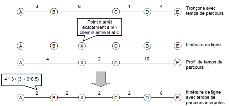 La répartition d’indicateurs relatifs aux tronçons est effectuée selon les différents tronçons. Cela signifie que pour les services excédant une limite d’intervalle de temps, les valeurs des tronçons dont le nœud d’origine est traversé dans l’intervalle de temps sont assignées à cet intervalle de temps. Des temps de passage sont dans un premier temps interpolés à chaque nœud et point d’arrêt traversés à partir des temps de parcours du profil de temps de parcours, qui sont ensuite comparés aux limites des intervalles de temps (Interpolation des temps de passage (temps de parcours en minutes)). Vous trouverez également des exemples de calcul ailleurs (Mesure de la prestation d’exploitation).