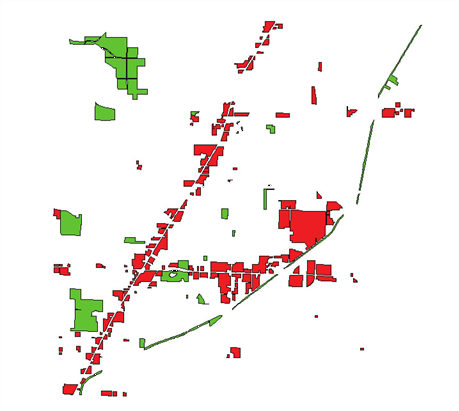 Outre l’importation de fichiers shape comme élément de réseau Visum, vous pouvez aussi insérer des fichiers shape comme arrière-plan. Ainsi vous pouvez par exemple insérer des occupations des sols (par exemple des zones résidentielles, des zones industrielles, des zones commerciales) pour une meilleure visualisation de votre réseau. Vous pouvez aussi insérer plusieurs couches de fichiers shape dans le réseau à cet effet (par exemple une couche pour les zones résidentielles et une couche pour les zones industrielles). Vous pouvez modifier l’ordre de représentation des couches et leur couleur. L’Illustration 224 montre un exemple dans lequel deux fichiers shape avec des occupations des sols pour des zones résidentielles et industrielles ont été intégrés comme arrière-plan.