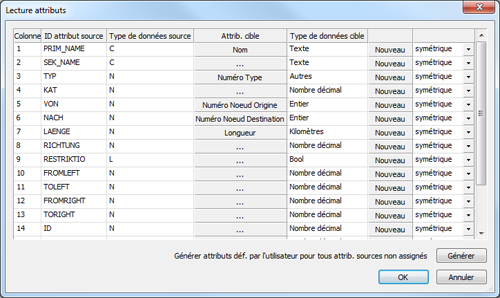 Lors de la lecture de polylignes comme tronçons, vous pouvez soit générer des tronçons orientés soit des tronçons avec sens aller et sens retour. Dans le cas de tronçons non orientés, il faut spécifier pour chaque attribut la manière dont il doit être interprété.