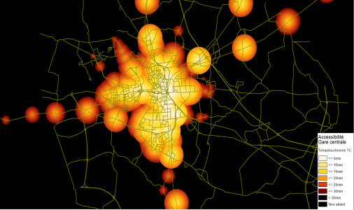 Des cas d’application caractéristiques de cette fonctionnalité sont les évaluations des lacunes de desserte dans les analyses de temps de déplacement TC ou TI de destinations majeures.
