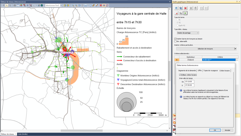 Si une affectation TC selon les horaires a été calculée, il est possible de spécifier un critère horaire pour le calcul de l’arborescence. Les chemins doivent être enregistrés en tant que liaisons à cet effet. Le critère horaire se rapporte au départ au niveau de l’élément de réseau sélectionné. Il se rapporte à l’arrivée uniquement à la fin d’un chemin partiel. En option, les résultats de l’arborescence peuvent être sortis de manière individualisée selon les intervalles de temps d’analyse comme pour l’arborescence TI.