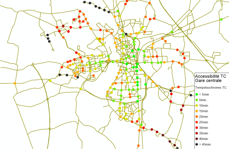 Illustration 245 : Temps de déplacement TC vers une destination : représentation par classes des arrêts