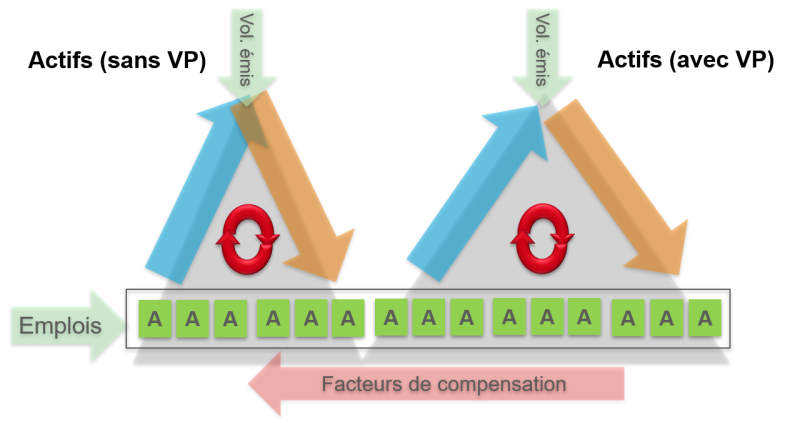 Quand le potentiel de destination est exploité par plusieurs couches de la demande, la détermination des facteurs de compensation Aj passe par les structures de modèle des couches de la demande. Cette option est possible dans les deux formes de modèle. L’Illustration 55 expose ce principe en s’appuyant sur deux couches de la demande Actifs avec et sans véhicule particulier pour le calcul selon la forme de modèle absolue.