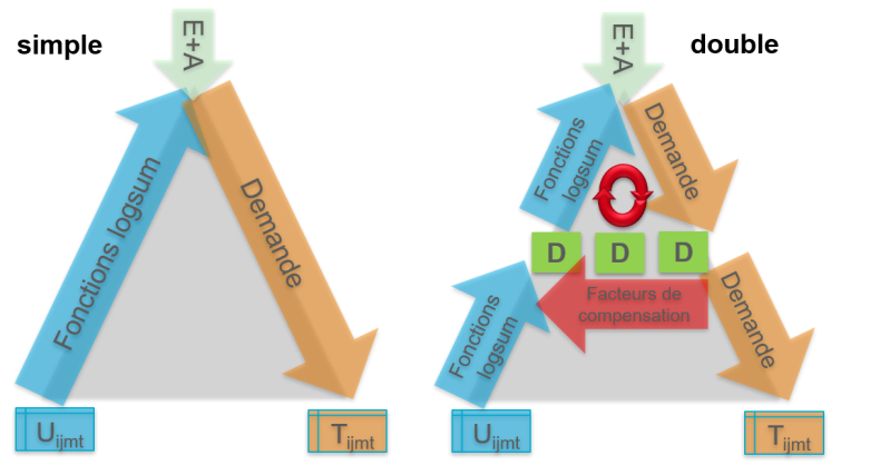 L’Illustration 54 clarifie la différence entre le choix de destination à contrainte simple et double lors du calcul de la demande (forme absolue). Le choix de destination est représenté sur un niveau central pour améliorer la lecture de l’image. L’option permettant de définir les possibilités de sélection dans un ordre quelconque demeure ici inchangée.