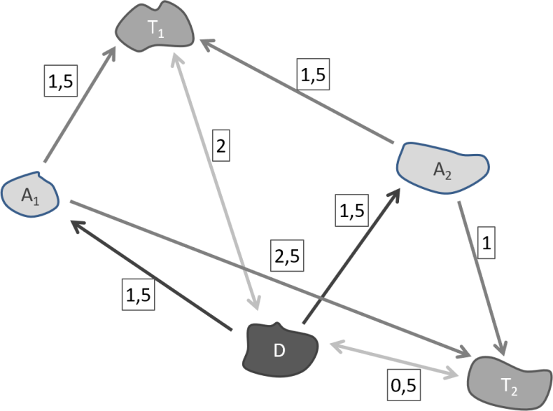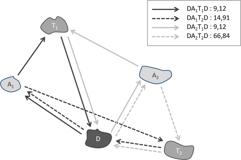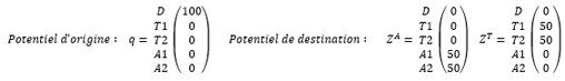 Différents chemins sont toutefois contenus ici : une partie des chemins passe par A1, et la deuxième partie des chemins passe par A2. Étant donné qu’aucun chemin individuel n’est encore encore disponible ici, mais uniquement la répartition du potentiel d’origine de 100 personnes sur le potentiel d’origine par zone pour l’activité principale Travail, nous désignons la nouvelle matrice ED→T également potentiel d’origine relatif à la destination.