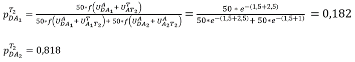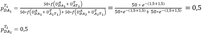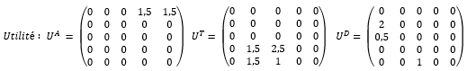Les personnes qui travaillent en T1, circulent ainsi à probabilité égale vers A1 et A2 pour leurs achats.