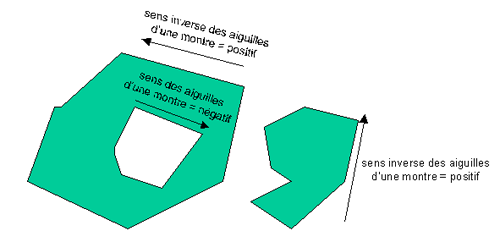 Une surface peut se composer de plusieurs faces (surfaces composées). En général, une surface composée se définit comme un ensemble de faces. Chaque face correspond à un polygone avec un signe. Celui-ci est positif lorsque les coordonnées du polygone le décrivent dans le sens inverse des aiguilles d’une montre, et négatif dans le cas contraire. Les faces positives sont donc numérisées vers la gauche (donc en sens inverse des aiguilles d’une montre) et les faces négatives vers la droite. Ceci permet de repérer facilement le type de la face lors de l’édition interactive des polygones dans l’éditeur de réseau. L’orientation de la face en constitue une propriété majeure. Les faces positives font partie de la surface tandis que les faces négatives en sont soustraites (elles sont considérées comme des trous).