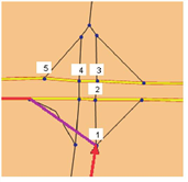 Si nous considérons à nouveau la zone de carrefour de l’Illustration 11 et partons du principe que tous les nœuds affichés sont regroupés en un macronœud, nous obtenons sept tronçons cordon. Comme un macromouvement au nœud part de chacun d’eux vers chaque tronçon cordon, nous obtenons un total de 49 macromouvements au nœud à ce macronœud. Tous ne sont pas rationnellement utilisables, car certains débouchent en contresens de voies à sens unique (Macromouvement au nœud non utilisable). Les macromouvements au nœud utilisables ( Macromouvement au nœud utilisable) sont exactement les 16 (ou 12 en cas de demi-tours interdits) relations rationnelles passant par le macronœud.