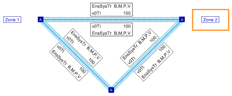 Vous pouvez voir dans la représentation de réseau du réseau de réunion que le tronçon en bas à gauche présente une vitesse inférieure de 20 km/h dans le réseau 2 et que l’EnsSysTr diffère dans les deux réseaux. Le tronçon en bas à droite est par contre identique dans les deux réseaux.