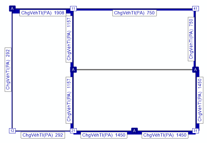 Exemple 4 : vous disposez de deux réseaux à infrastructure identique mais à l’offre TC différente. Vous souhaitez visualiser les différences de charge en sélectionnant différents critères (nom de ligne, jour de service commercial) à l’aide de barres de tronçons. Des attributs de tronçon indirects qui se rapportent à une offre filtrée sont requis à cet effet, par exemple Sum:Tracés itinéraire de ligne\Sum:Éléments de profil TP utilisant\SumActifs:Éléments de service\Charge (PA). Le filtre dans le réseau ouvert est appliqué dans les deux réseaux, et ce dans le contexte respectif du réseau. Vous pouvez ainsi facilement représenter les différences des charges de tronçon respectives.