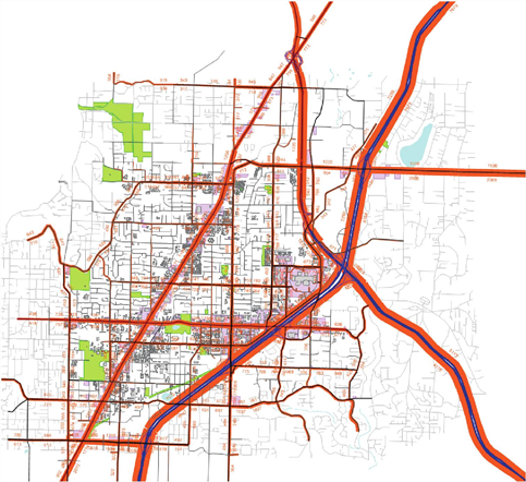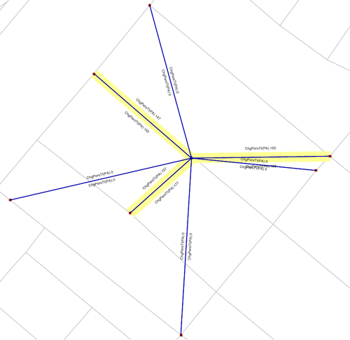 Sur les tronçons et les connecteurs, vous pouvez représenter des barres dont la largeur dépend des valeurs d’un attribut direct ou indirect du tronçon ou du connecteur (Utilisation : Représenter des propriétés avec des barres). Vous pouvez par exemple visualiser la charge de tronçon d’une affectation TI en vous servant de l’attribut Charge[Véh] TI comme échelle pour la barre de tronçon, comme dans l’Illustration 250.