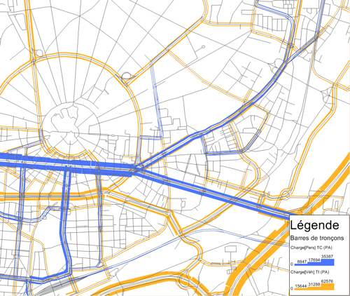 Vous pouvez représenter un nombre illimité de barres le long du tronçon ou du connecteur avec des attributs différents pour chacune. Vous pouvez ainsi représenter simultanément la charge d’une affectation TI (Attribut Charge[Véh] TI) et la charge d’une affectation TC (Attribut Charge[Pers] TC) sur un tronçon, comme le montre l’Illustration 252.