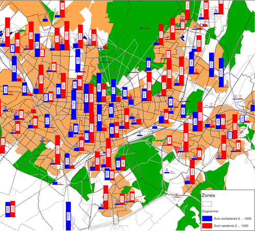 Dans l’éditeur de réseau, vous pouvez afficher des libellés pour les éléments de réseau sous forme de diagrammes que vous pouvez configurer librement (Utilisation : Pourvoir les éléments de réseau de diagrammes). Vous pouvez choisir entre des diagrammes en colonnes et des diagrammes circulaires. Pour les zones, vous pouvez par exemple représenter le nombre d’habitants et le nombre d’emplois sous forme de diagrammes en colonnes (Illustration 258).
