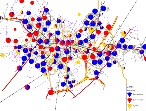Vous pouvez aussi représenter les résultats du choix modal (Choix modal), la répartition de la demande de déplacements sur les différents modes de transport, sous forme de diagrammes circulaires pour chaque zone (Illustration 259).