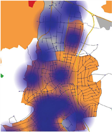 Vous pouvez également représenter les aires de rabattement d’arrêts par classes. Dans l’Illustration 265, on a représenté des aires de rabattement avec un rayon de 300 m autour des arrêts. Les cercles pour des arrêts avec plus de 1 000 départs par période d’analyse sont représentés en rouge, ceux pour des arrêts avec moins de 500 départs en orange et ceux pour des arrêts avec moins de 100 départs en vert. Vous pouvez ainsi représenter dans un même graphique la fréquentation des arrêts et la desserte de l’ensemble du réseau par les TC.