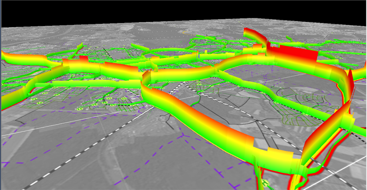 Les représentation de barres 3D permettent de représenter les attributs de tronçon sous la forme de barres en trois dimensions en particulier. Pour restituer le plus fidèlement possible les résultats d’affectation et éviter les lacunes, les données des macromouvements au nœud et connecteurs sont intégrées en sus. Une coloration hypsométrique est possible comme dans la représentations de prisme 3D. Outre les données statiques, il est aussi possible de représenter des attributs liés aux intervalles de temps d’analyse. L’aperçu de réseau spatial est couplé ensuite au réglage de l’intervalle de temps de façon à pouvoir animer et suivre des évolutions temporelles dans cette représentation.
