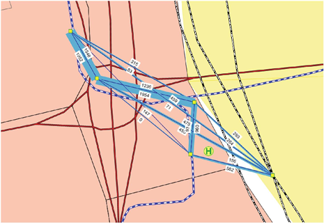 Avec la couche graphique Relations de correspondance, vous pouvez représenter les relations de correspondance entre des zones d’arrêt (actives) des arrêts (actifs) sous forme de barres de charge dans le réseau. Cet affichage est requis dans les réseaux TC dans lesquels la hiérarchie des arrêts sert à modéliser les correspondances de manière réaliste. Pour chaque paire de zones d’arrêt, vous pouvez représenter un tronçon de correspondance (ligne droite entre les zones d’arrêt) et une ou plusieurs barres pour la représentation proportionnelle des valeurs. Vous pouvez restreindre la représentation à des relations de correspondance isolées à l’aide du filtre de zones d’arrêt ou d’une représentation par classes des relations de correspondance (Utilisation : Représenter les relations de correspondance entre zones d’arrêt). Outre les voyageurs en correspondance, vous pouvez aussi représenter d’autres attributs graphiquement, tels que les différents temps de marche.