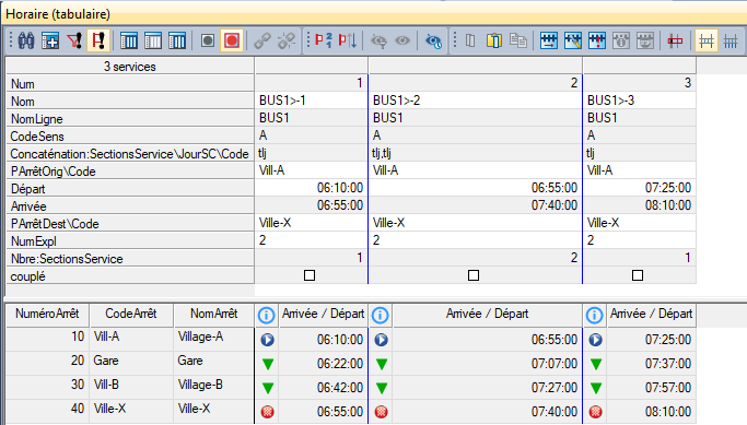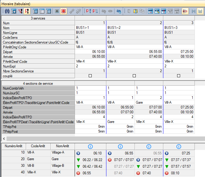 Vous observez tant les services et leurs attributs que les sections de service de chaque service quand les sections de service sont affichées. Dans l’exemple, le service numéro 2 comporte deux sections de service, dont la première commence au point d’arrêt 10 Vill-A et se termine au point d’arrêt 20 Gare, la seconde commence au point d’arrêt 20 Gare et se termine au point d’arrêt 40 Ville-X.