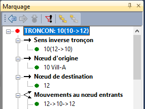 Les éléments de réseau actuellement marqués et leurs éléments correspondants sont représentés dans un explorateur dans la fenêtre Marquage. Les éléments correspondants sont les éléments de réseau qui sont reliés avec un élément de réseau par une relation de modèle de réseau.
