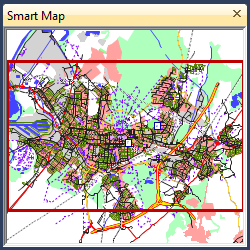 La fenêtre Smart Map contient une vue d’ensemble du réseau à petite échelle. Un rectangle rouge affiche la section actuellement représentée dans la fenêtre Éditeur de réseau. Quand le facteur de zoom de la fenêtre Éditeur de réseau est tel qu’il n’est plus possible de représenter la section dans un rectangle, un réticule est affiché.