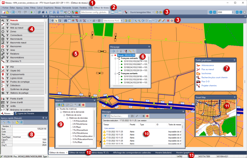 Des messages, alertes et détails sont affichés ici. Vous pouvez rapidement accéder à l’emplacement concerné dans la fenêtre Éditeur de réseau au moyen des entrées dans la liste (Fenêtre Messages).