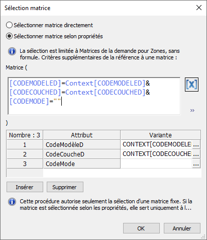 Nota : Lors de l’appel de la fenêtre, les relations de contenu sont prises en considération et seules les matrices appropriées sont affichées. |