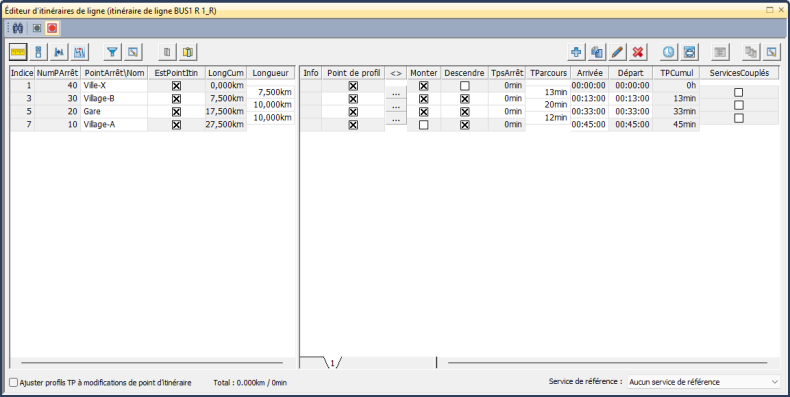 Dans cette fenêtre, vous pouvez éditer les tracés d’itinéraires de ligne à gauche et les profils de temps de parcours assignés à droite. Les deux parties coïncident.
