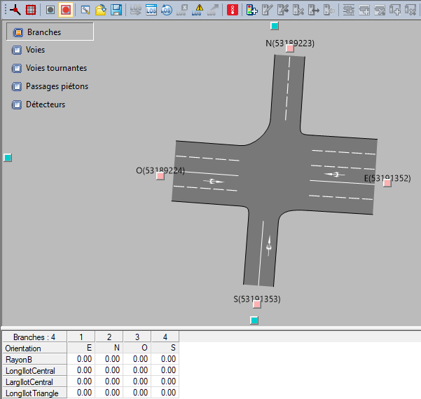Nota : Si vous utilisez le procédé de régulation RBC, vous devriez définir les détecteurs uniquement dans l’interface d’alimentation en données RBC. Les détecteurs créés dans l’éditeur de nœuds obtiennent automatiquement le type de détecteur Visum. Dans RBC, un détecteur de ce type n’a aucune signification, et est supprimé lors de l’ouverture de l’interface d’alimentation en données RBC. |