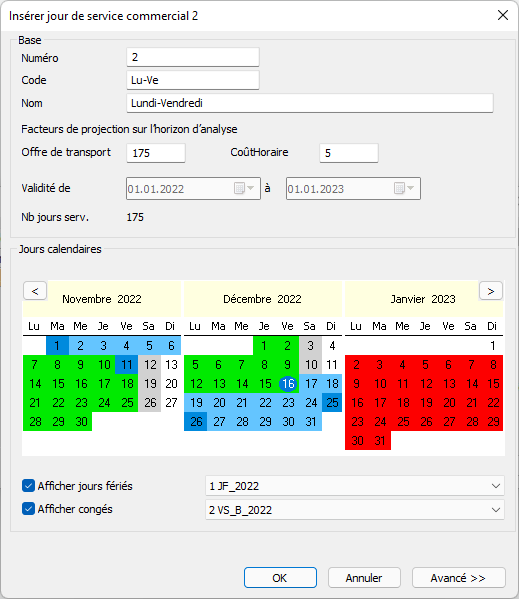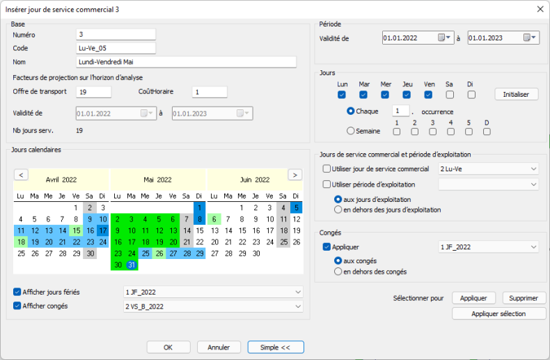 - Jours de service commercial et période d’exploitation (sélection identique à celle d’un jour de service commercial existant)
