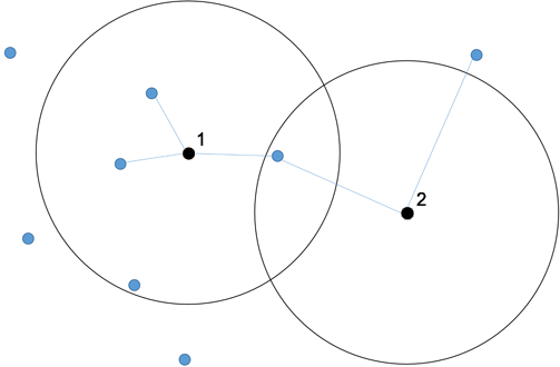 Soit un rayon. Soit le nombre minimal de 2, et le nombre maximal de 3. Le nœud 1 est relié au nombre maximal au sein du rayon spécifié dans le graphique suivant. Un seul nœud de destination est situé au sein du rayon autour du nœud 2 – un autre nœud de destination doit encore venir s’ajouter hors du périmètre.