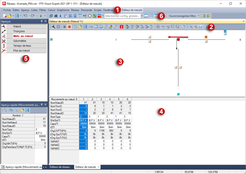 L’élément actuellement sélectionné est représenté dans l’affichage schématique. Vous pouvez éditer l’élément en utilisant des cases de sélection colorées dans les aperçus Nœud, Macronœud, Tronçons, Mvts au nœud, Macromvts nœud et Géométrie et basculer vers les éléments qui sont en relation avec l’élément de réseau actuellement marqué. Vous ne pouvez pas effectuer de modifications dans les aperçus Temps de feux et Flux au nœud.