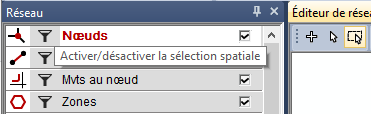 La barre d’outils Sélection spatiale s’ouvre et l’option Activer/désactiver la sélection spatiale est affichée pour chaque type d’élément de réseau dans la fenêtre Réseau.