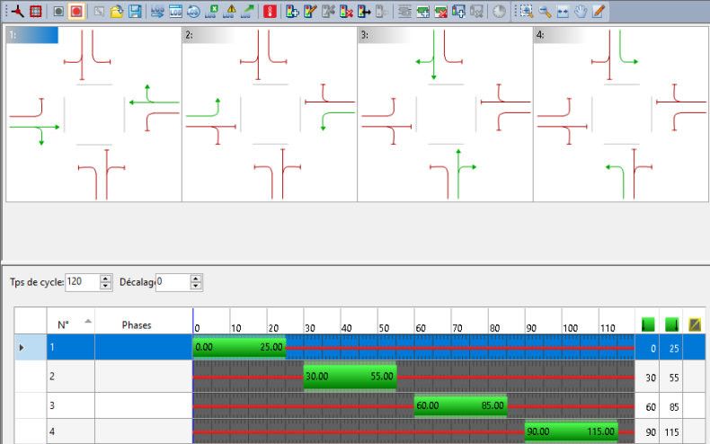 Chaque carré de la partie supérieure représente une phase. Les flèches représentent des lignes de feux. Vous pouvez gérer l’assignation des lignes de feux aux phases en cliquant sur ces flèches. Toutes les lignes de feux assignées à une phase sont en vert.