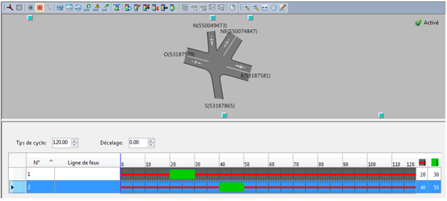 La zone inférieure de la fenêtre affiche les temps de feux. Chaque ligne représente une ligne de feux.