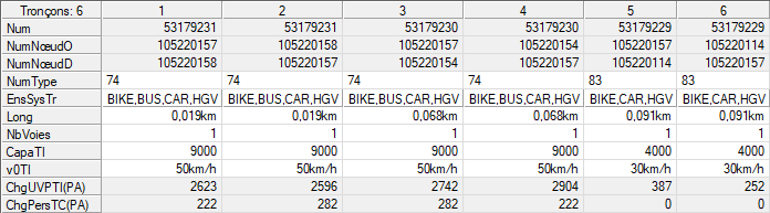 Chaque colonne de l’affichage tabulaire décrit un tronçon et chaque ligne un attribut de cet élément.