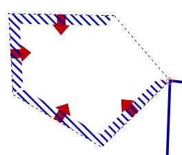 Les arêtes du polygone de contour sont représentées comme un ruban élastique. Les hachures et les flèches indiquent le sens de la surface (Bases théoriques : Le modèle de surfaces dans Visum).