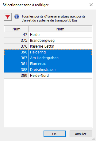 La fenêtre Sélectionner zone à rediriger s’ouvre. Elle répertorie tous les points d’itinéraire qui sont situés au niveau des points d’arrêt du système de transport de l’itinéraire de ligne sélectionné.