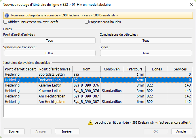 Les sections d’itinéraires de système disponibles que vous pouvez utiliser pour rediriger l’itinéraire de ligne sont répertoriées ici. Les colonnes de Points d’arrêt de départ, Points d’arrêt d’arrivée, Nom, CombiVéh, Temps de parcours, Lignes et Services sont affichées pour chaque itinéraire de système. Nota Par TParcours, on entend le total du temps de passage et des suppléments de temps d’accélération et de décélération |