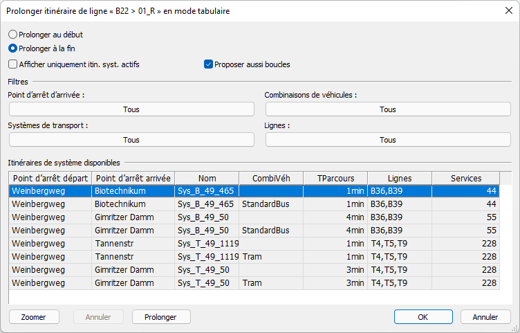 Ceux-ci sont à nouveau répertoriés dans la fenêtre Prolonger itinéraire de ligne <...> en mode tabulaire.