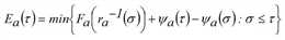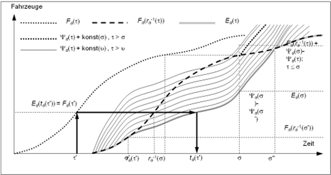 In der Annahme, dass die Kapazität am Ende einer bestimmten Kante a∈A nicht aufgrund von Rückstaueffekten reduziert ist, kann für ein Fahrzeug, das die Kante zum Zeitpunkt τ betritt, die unterkritische Ausgangszeit ra(τ) abhängig vom bisherigen Teil der Zuflussganglinie ausgedrückt werden, was dem Zufluss fa(σ) zu jedem Zeitpunkt σ ≤ τ entspricht.