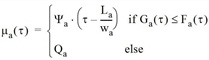 Ist der kumulierte Zufluss Fa(τ) zum Zeitpunkt t gleich oder größer als der maximale kumulierte Zufluss Ga(τ), sodass sich zu dem Zeitpunkt ein Rückstau bildet, dann ist die Zuflusskapazität μa(τ) durch die Ableitung dGa(τ)/dτ des maximalen kumulierten Zufluss definiert; andernfalls entspricht sie der Eingangskapazität Qa.
