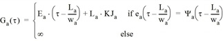 In den verwendeten Fundamentaldiagrammen ist der überkritische Ast linear und υa(τ) folglich umkehrbar. Da wa(q) = wa, ist die Zeit bei υa(τ) = τ, basierend auf [43], σ = τ - La /wa. Außerdem ergibt sich Ha(τ) = Ea(τ) + La • KJa, basierend auf [44] q/va(q) = KJa - q/wa. Daher ergibt sich der maximale kumulierte Zufluss Ga(τ), der die Kante zum Zeitpunkt t entsprechend der Zuflussbelastung hätte befahren können, gemäß folgender Gleichung: