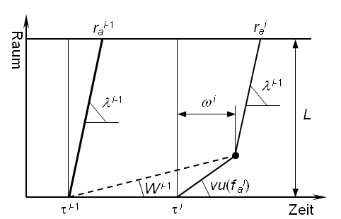 Um diese Schwierigkeiten zu überwinden, wird – wie Abbildung 125 darstellt – davon ausgegangen, dass zu jedem Zeitpunkt ri, 0 ≤ i ≤ n-1, eine fiktive Stoßwelle auf dem Anfangsabschnitt der Kante erzeugt wird, die die tatsächlichen Belastungen Φ(fai+1) von einer Region trennt, in der die durchschnittliche Geschwindigkeit λi = L / (rai - τi) des Fahrzeugs, das die Kante zum Zeitpunkt τi erreicht, herrscht.