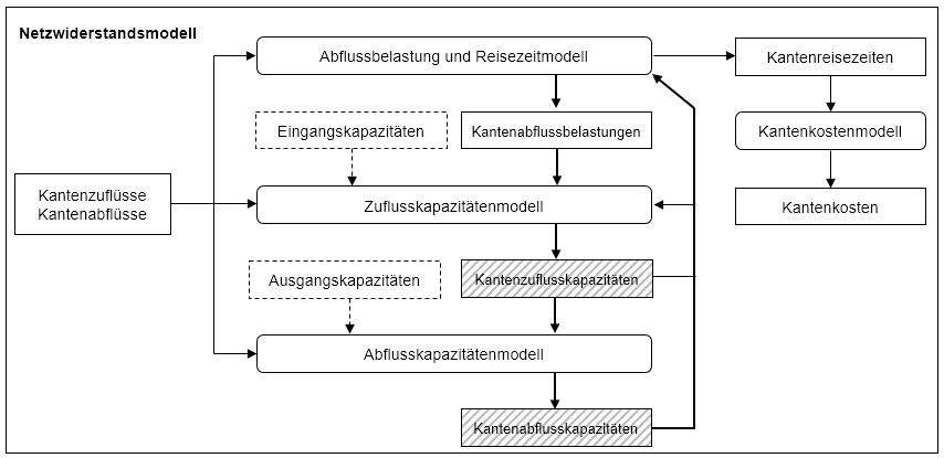 Das Netzwiderstandsmodell besteht aus drei wechselseitig abhängigen Teilmodellen, dem „Abfluss- und Reisezeitenmodell für zeitlich variierende Kapazitäten“, dem „Zuflusskapazitätsmodell“ und dem „Abflusskapazitätsmodell“, die iterativ berechnet werden. Die drei Modelle zeigt Abbildung 122 im Kontext. Die Reisezeiten, die sich als Lösung aus den drei rückgekoppelten Modellkomponenten ergeben, werden durch ein Kantenkostenmodell mit den monetären Kosten zu generalisierten Kosten zusammengefasst.