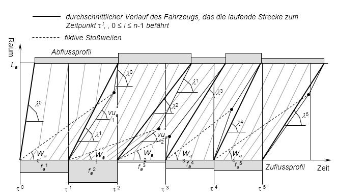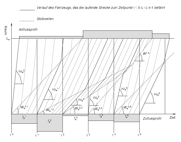 Auf der Basis der STKW verändern Fahrzeuge ihre Geschwindigkeiten unmittelbar. Wie Abbildung 124 zeigt, sind Trajektorien stückweise linear, wenn die Ganglinie des Zuflusses stückweise konstant ist. Zudem ist das Raum-Zeit-Diagramm in Regionen mit jeweils homogenen Belastungszuständen unterteilt, die durch lineare Stoßwellen begrenzt sind. Die Steigung Waij der Stoßwelle, welche die zwei unterkritischen Belastungszustände Φ(fai) und Φ(faj) trennt, ist folgende: