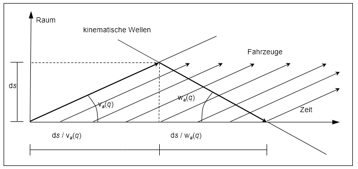 Definitionsgemäß sind die Punkte in Zeit und Raum, die einen geraden Linienverlauf ausmachen, der durch eine Stauwelle erzeugt wird, durch den gleichen Belastungszustand gekennzeichnet. Zudem zeigt Abbildung 127, dass die Anzahl der Fahrzeuge, auf die die überkritische Welle trifft, bezüglich der Abflussbelastung q für eine kleine in Gegenrichtung zurückgelegte Strecke ds dem Zeitintervall ds