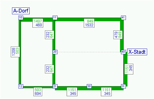 Die Tabelle 144 zeigt die wesentlichen Eingabedaten für das Beispielnetz. Wählt man bei der Suche folgende Parameter, dann werden in einer einzigen äußeren Iteration alle 3 denkbaren Routen gefunden: